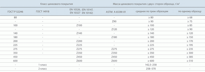 Основные классы толщины цинкового покрытия
