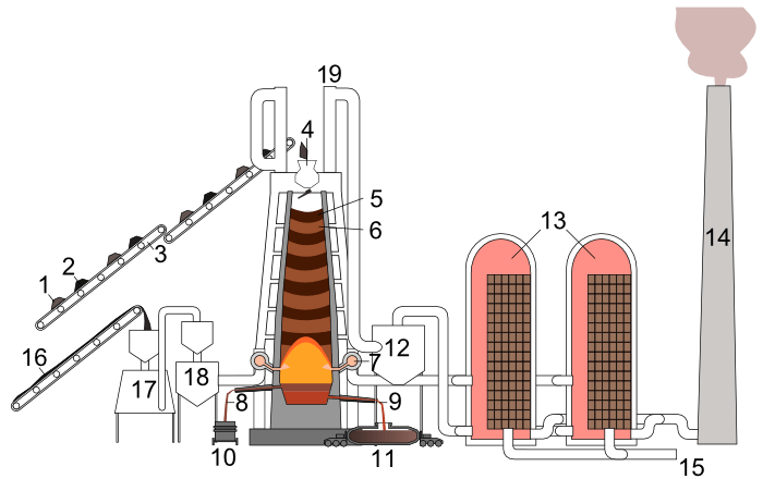 - Шахта: Зона, в которой происходит нагрев и восстановление руды.